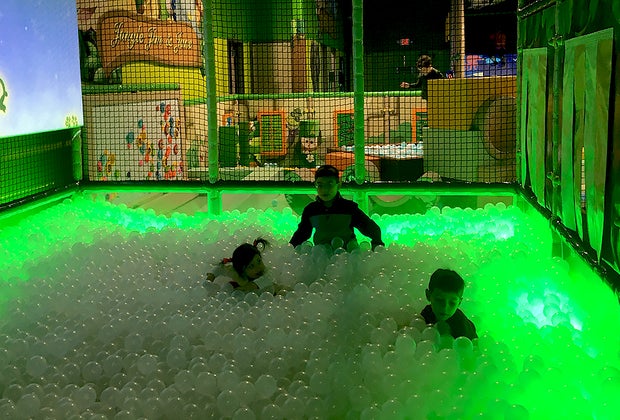 Kids will love monkeying around in a huge (and clean!) ball pit, where interactive games are projected onto a wall nearby. My boys loved tossing balls at the images that flew by.