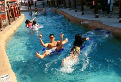 I was immediately pulled onto one of the speed slides by my girls and that was quite an intense ride. They visited it repeatedly, but one time was enough for my old lady bones. Thankfully, there are tons of nice deck chairs, some in the sun, some under shade, and I retired there gladly and peacefully while my maniacs raced around. I did a couple of truly relaxing rounds on the Lazy River (also my husband's favorite, as you can tell from the photograph below) and enjoyed the slides and pool.