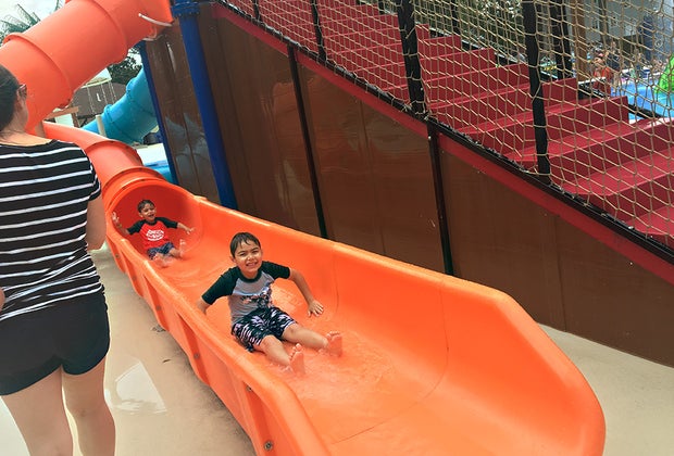After slathering on sunscreen on my kids, the Surf Shack caught my boys' eyes (ages 5 and 8). This tower holds two twisty water slide tunnels, and an enormous bucket that dumps water on people below. I was very impressed that the park dedicates two staff members to this feature. One stays at the bottom of the steps, carefully allowing only two people to climb the stairs at a time (no pushing or elbowing here!), while another staff member keeps an eye at the bottom of the slide to prevent crashes from lingering riders.