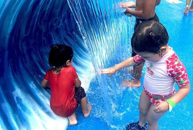 All throughout the park are water sprayers that you can maneuver to squirt a friend; small dump buckets; ocean- and pirate-themed springs to play on and touch; palm trees and mushrooms with light rain; and more. No matter the age, kids (and their caregivers) are in for some wild, wet fun!