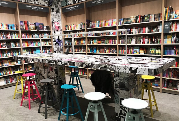 Around the corner, young adult readers have a section of their own. Graphic novel–printed wallpaper matches the top of a long communal table, where friends can gather to read, do work, or just hang out.