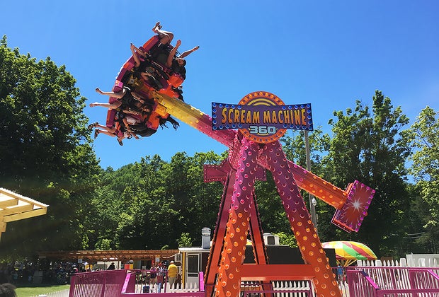 Land of Make Believe’s newest attraction, Scream Machine 360, sits smack-dab in the middle of the park. You can’t miss it: The giant pink and orange pendulum swings and lifts riders, all the while spinning seats upside down, offering a higher octane of fun for bigger thrill seekers and older kids.