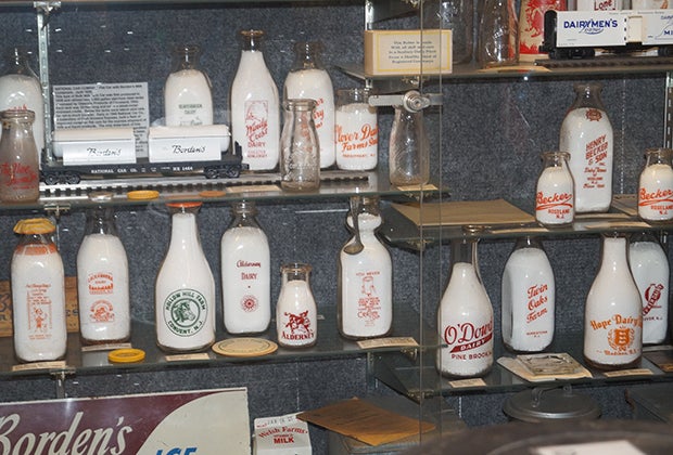 After our excursion train ride, we stepped into the tiny and blissfully air-conditioned museum, which has the feel of a well-kept secret: little gems of history everywhere you look. You could spend half an hour just finding all the fun little stores and structures on the big model railroad that takes up most of the main floor. My kids also enjoyed the displays of train bells and whistles, and for some reason, they were really into the milk bottle display; they were fascinated by the thought of milk being delivered by trains! I was more taken with the photography, glimpses into a long-ago world when train travel and merchandise transport were essential to our country.