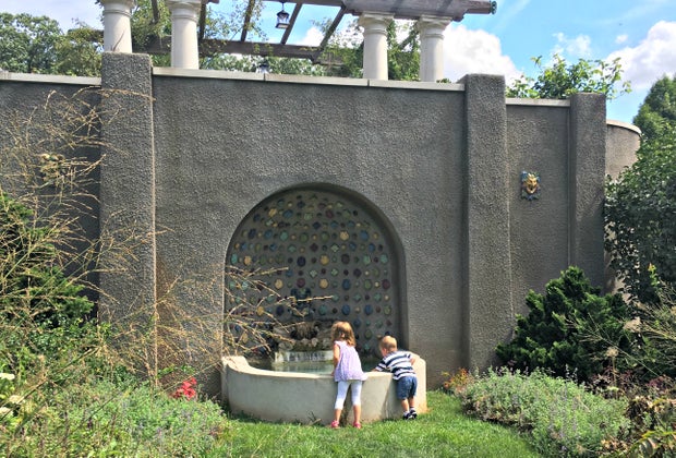 We visited on a summer weekend morning and nearly had the place to ourselves, so it was peaceful, too. The kids (both under age 5) raced along the walkways, which were a mix of paved, gravel, stone, and sometimes grass or dirt. It seemed we discovered a new splash of colorful flowers or structure around each bend, so the kids looked forward to the surprises and never complained. Nor did we have to worry about them stepping in the wrong spot, or knocking things over! There was plenty for them to climb on and around, so that they were fully engaged. A wishing well toward the entrance that we initially missed captivated them for a solid 10 minutes.