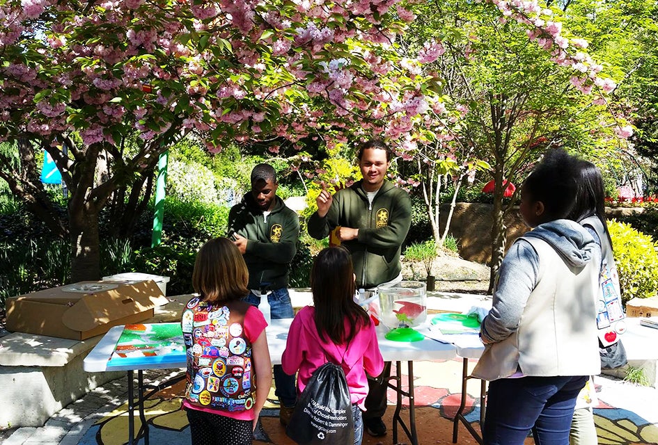 Family programming is provided from March through November, with events happening nearly every weekend, and there is a Santa breakfast in December. Upcoming events include Earth and Arbor Day and Butterflies and Birds festivals, and other happenings include the Peach, Princess & Pirate Celebration, holiday themed weekends, and more. A small amphitheater hosts demonstrations and storytelling, and in the warm months kids can cool off in the main plaza's spray ground.