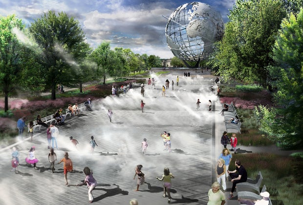 The long-anticipated redevelopment of the plaza between the Unisphere and the Fountain of the Planets in Flushing Meadows Corona Park is on track for a late-summer completion! The three fountains built for the 1939 and 1964 World's Fairs get a substantial update, including spray jets and a mist garden, and Parks Department officials confirmed they should be flowing before the end of the season. We're already hoping for a late summer heatwave and more time to enjoy this spectacular water playground since sprinklers are generally turned off once the temps dip below 80 degrees regularly. The revamp plans also include fresh landscaping and more places to relax around the fountains.