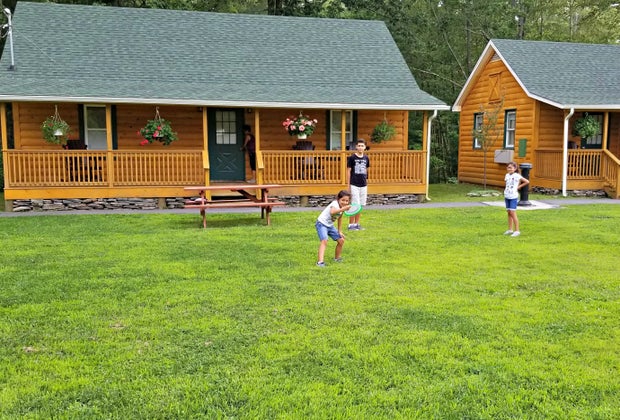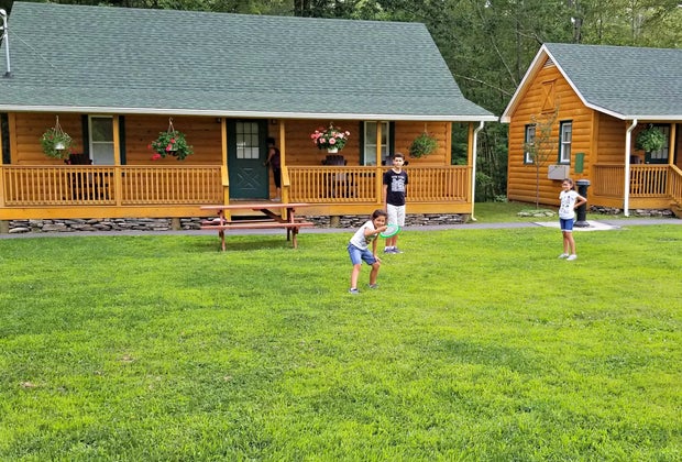 If you need more space than a standard room provides, or if you just want a slightly more rustic experience, you might opt for one of the Catskill cabins. The standard cabins include a king bed, bathroom and cozy front porch. The cabin suite—where my family stayed—is a large two-bedroom suite with a full living room, bathroom, kitchenette, and gorgeous front porch with wooden rocking chairs and hanging plants. All cabins look out over an expansive lawn, a beach volleyball section, picnic tables and a fire pit surrounded by Adirondack chairs.