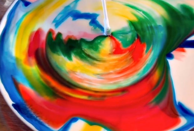Try picking up the dish and putting it back down again to observe what happens. Try dipping the cotton swab right into the center of one of the color droplets, or dip the swab into the white spots between the color drops. When the action slows down, dip the other end of the cotton swab into the dish soap and start experimenting again!