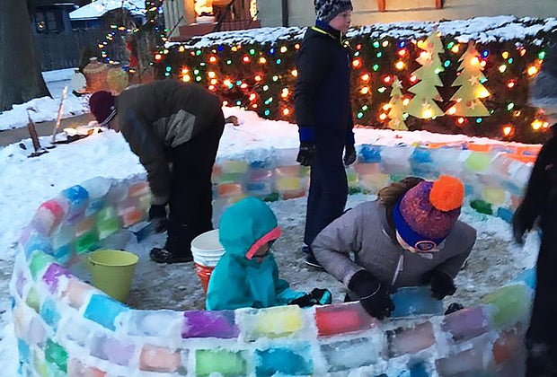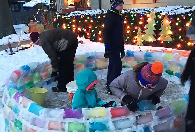 His strategy was to fill half-gallon drink cartons with colored water, let them freeze, release the ice blocks, then stack them in a circle, using an ice/water mixture as mortar.