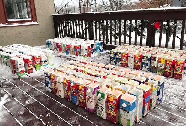 These cartons contain the frozen, colored bricks for the igloo. Photo by Kevin Riedy