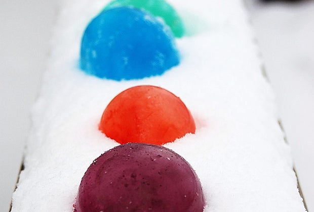 Another form of winter art involves freezing colored water to make "gems." Place a drop of food coloring into a water balloon, then carefully fill the balloon with water. Do this slowly to avoid spills! If you can do this with a pitcher and funnel outside, all the better. Create multiple balloons containing various colors. Knot the end of each balloon and place them in the snow outside to freeze. If you don’t have outdoor space, then put the balloons in a plastic bag (to protect against any leakage) and place them in your freezer. When they are frozen solid, cut the balloons open. Be careful, this can get messy, as there may be some residual colored water; doing this outside with old gloves on is a good idea. Once you’ve unmasked your rubies, sapphires, and emeralds, decorate your front porch or stoop with them.