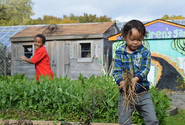 Preschoolers playing and planting at the summer Children's Garden. Photo by Anne Tan-Detchkov/courtesy of QBG.