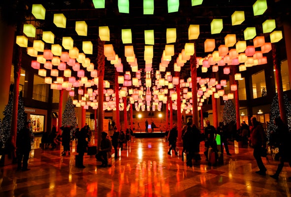 A canopy of 650 gorgeous lanterns bathes Brookfield's glass-enclosed, Christmas-spirited Winter Garden in a glow of lights as families and holiday shoppers gather below. Adding an interactive element to the display, kids can control the lights via the installation's multiple Wish Stations—and each interaction equals a donation to the GRAMMY in the Schools music education program.
