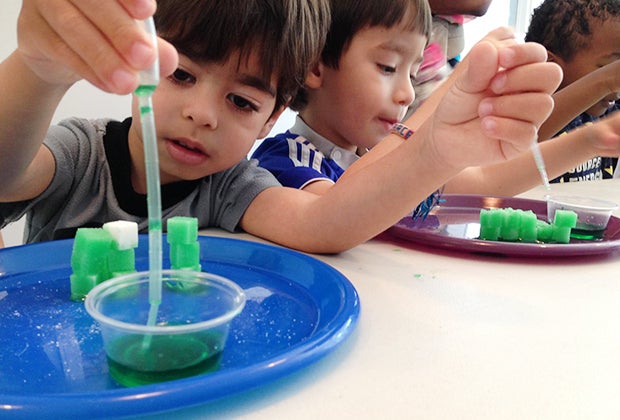 The space itself might be new, but the program offers an established and well-thought out, inquiry-based curriculum. Launched by the affable and experienced Carmen Castillo-Barrett, a New York City teacher, Kiddie Science introduces children to scientific concepts through hands-on experimentation. Some classes are grouped by age, with the younger crowd requiring parental participation. Others are a mishmash of ages and experience levels. Class sizes vary with age, from a total of six families for smaller tots to up to 10-12 kids for older budding scientists. (Larger groups also utilize up to three staff members, ensuring every child ample attention.)