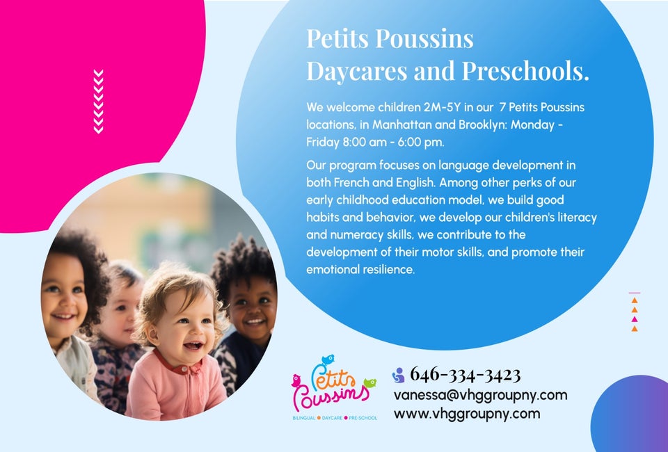 At Petits Poussins, families benefit from a top notch bilingual educational program, with the flexibility of a daycare, Monday - Friday (8am - 6pm).