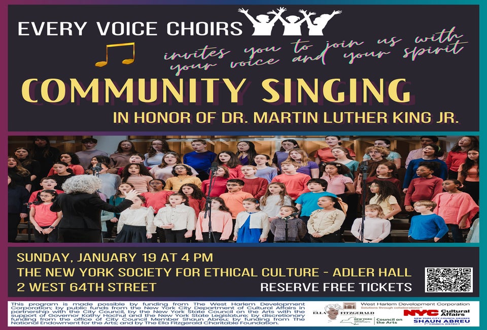 Every Voice Choirs and The New York Society of Ethical Culture hosts an afternoon of community singing for peace and justice to commemorate the birthday of Dr. Martin Luther King Jr.