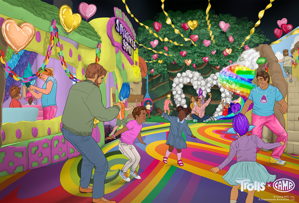 Step into the joyful, rainbow-colored world of Trolls for a one-of-a-kind musical adventure at Trolls x CAMP. Play and explore in Bergen Town, Vacay Island, and Pop Village —all your favorite locations from the Trolls movies brought to life! It all culminates with a wild, interactive car chase and a live Trollpop concert .