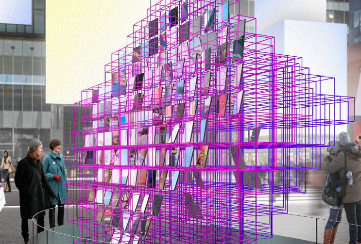 Tilted in various directions within a steel frame that evokes the outline of an anatomic heart, the 125 mirrors of Heart Squared transform the spectacle of Times Square into kaleidoscopic images of people, buildings, and brightly-lit billboards. While the position of each mirror seems random, the designers developed a specialized technique to calculate the specific angles in order to hide a playful surprise. As viewers move around the structure, those hundreds of reflections suddenly coalesce, revealing a pixel heart of urban life surrounded by a field of mirrored sky.