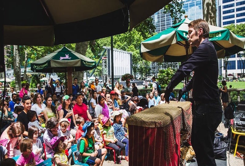 Puppets, puppets, and more puppets bring whimsy and fun to Bryant Park's summer line-up. WonderSpark Puppets performs from a repertoire that includes Goldilocks & The Three Bears, The Lion & The Mouse, and Princess Petunia and the Dragon, to name but a few.
