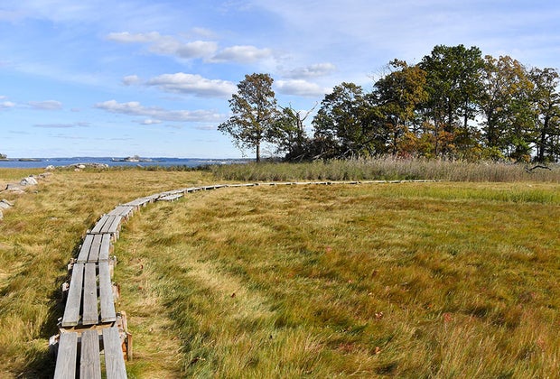 Explore the Marine Park Salt Marsh during a light hike. The almost 1-mile loop takes you through a small slice of this 500-acre preserve. The terrain is easy, and the views along Gerritsen Creek with Manhattan in the distance are lovely. You're likely to see osprey soaring overhead and gorgeous old trees. You can even take a stroller along the trail, though be warned it's flattened gravel, not pavement. Consider joining an Urban Park Ranger-led program to get more out of the experience. While convenient parking is available across the street, accessing the Marine Park Salt Marsh without a car is inconvenient.