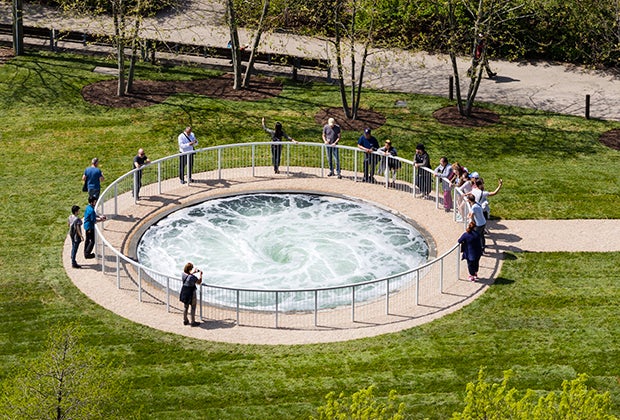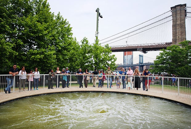 Kids and adults alike will be mesmerized by Anish Kapoor's Descension, a giant whirlpool installed in Brooklyn Bridge Park, which runs 9am to 9pm daily. The 26-foot (diameter) swirling water sculpture is sure to capture your attention. But be sure not to throw any gravel inside the waters or the security guard will yell at you. On display through September 2017. Photo by the author.