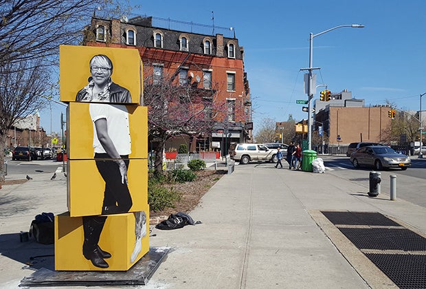 Exquisite Corpse by Fanny Allié, installed at Clinton Hill's Putnam Plaza, takes its name from the Surrealist drawing game. Passerbys can rotate the panels to create different people.On display through March 2018. Photo courtesy of DOT.
