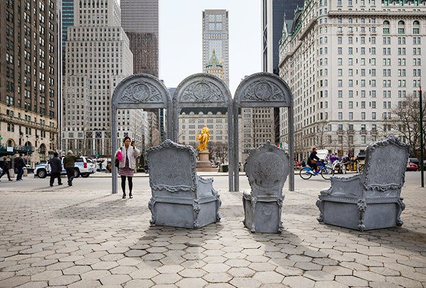 Liz Glynn's Open House features lavish Louis XIV sofas, chairs, footstools and doorways, with an urban twist: they are all cast in concrete. It evokes the lavish styles of the elite at turn of the 20th century in contrast with its surroundings at the entrance of Central Park. Get a waffle from the Wafels & Dinges truck (which is often parked beside it) and have a seat, then head off into Central Park afterward. On display through September 2017.