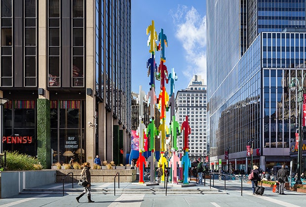 Plaza33, the pedestrian plaza near Penn Station, is the site of Jonathan Borofsky’s Human Structures. Kids will love walking underneath the 36-foot tall colorful tower and gazing upward. Photo courtesy of Plaza33.