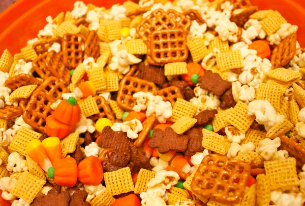 This seasonal snack mix is a blend of sweet and salty and tastes like pure Halloween fun - it’s also a great way to use up all that extra candy corn that you can’t stop eating. This year, we used a little bit of the following: