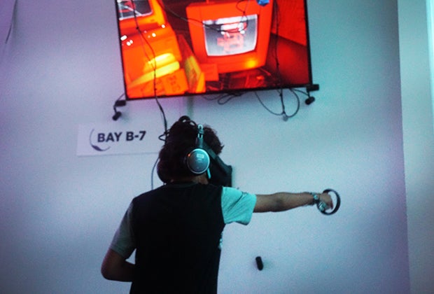 - Lastly, be prepared for the awkwardness. You'll look silly when you're in the midst of a game, stuck in your own virtual world. It was more than mildly entertaining watching my son get really into the game, and he enjoyed watching me, too. So, if there's awkwardness, it's of the shared variety. Just let go and have a good time. Most gaming bays have a big-screen TV where you can watch the action that's happening in the headset, so people tend to fixate on that more than whoever is playing the game.