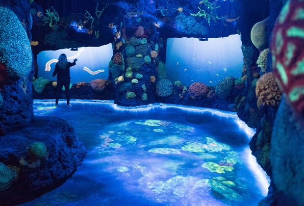 Moving from the nighttime reef into a pitch black room illustrates the intense darkness of the ocean depths and allows you to focus on its symphony of sounds. It's completely dark, so it takes a moment to adjust—and you'll definitely want to hold little hands when entering this room.