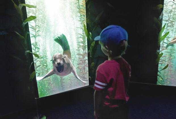 At the end of the maze, visitors are rewarded with a series of screens that feature adorable interactive sea lions. Stand in the circle just in front of a screen, move left or right, and watch your friendly sea lion respond. See if you can figure out how to get it to flip and do other tricks for you. It wasn't easy getting my 8-year-old to say goodbye to this part of the experience.