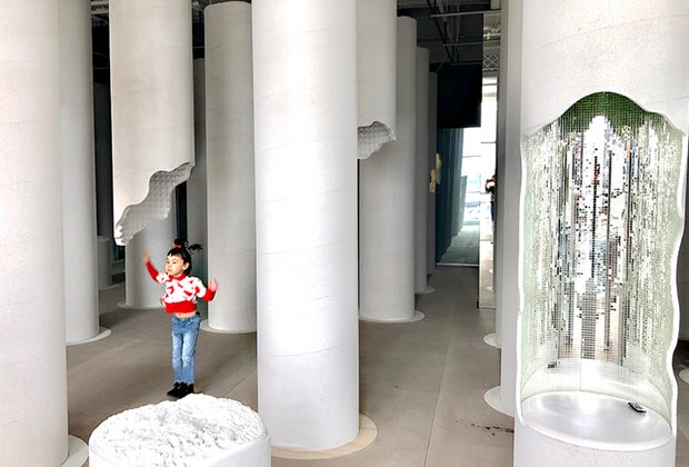While my little Yeti played house, I did a quick spin through the space, weaving in and out of the columns. Some were lined with foam prisms while some others were adorned with peek-a-boo cut-outs and white ping pong balls. Strings of white beads hung from some of the openings in the columns, shielding the entryways. The mirrored walls in the room created an interesting infinity effect—as well as infinite opportunities for selfie-taking.