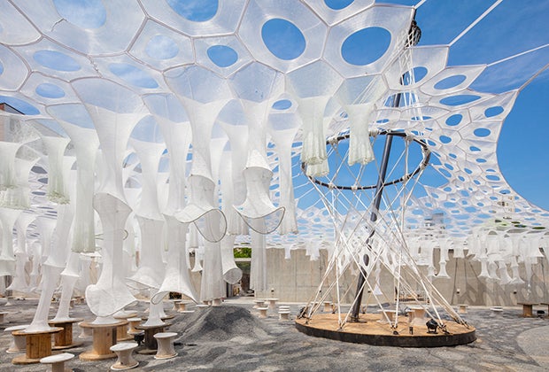 Lumen creates an alien-like landscape in the courtyard of MoMA PS1. Used as the adult playground at the museum’s nighttime summer shindigs, it’s also a fun place for kids to romp during the day. Misting water elements even offer a little relief from the heat. Check out our video, which describes it better than we ever could with words.