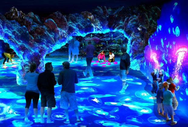 No wet suits are required—in fact, you won’t even get wet. Instead, this virtual 60,000-square-foot aquarium of sorts will rely on video mapping, animation, huge projection screens, sound, and even holograms and touch screens to show visitors not only the magic of the ocean, but also the life it contains.