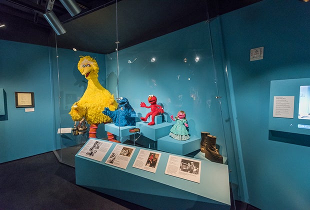 Installation view of Big Bird, Cookie Monster, Elmo, and Prairie Dawn puppets in the "Sesame Street" section.