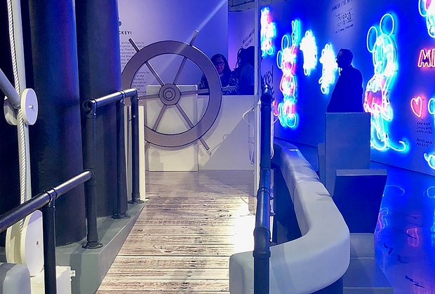 The experience begins with a quick welcome video, highlighting key Mickey moments from past and present. Next up is the "Hello Mickey!" room, featuring Walt Disney’s Academy Award and an impressive wall of neon art. Kids will love climbing aboard the giant steamboat, just like Steamboat Willie. (Parents, keep your cameras at the ready for photo ops.)