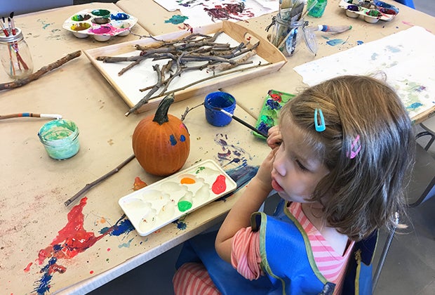 Toddlers and preschools can sidle up to several large tables and a variety of supplies for art making, from paints and dot markers to interesting media (we painted pumpkins and branches in October). Supplies are placed on the tables for kids to pick from, and a teacher is on hand to assist with questions. A large communal sink with kid-size step stools make for easy cleaning up.