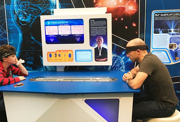 Science Fiction, Science Future features 10 interactive displays that make learning hands-on. For example, one popular station requires that two participants don circular head bands that allow them to move a small, encased ball by pitting their brain waves against each other. (Interestingly, relaxed brain waves are said to move the ball further.) During my visit, many parent-child teams were competing to see who could move the ball the furthest in a spirited competition.