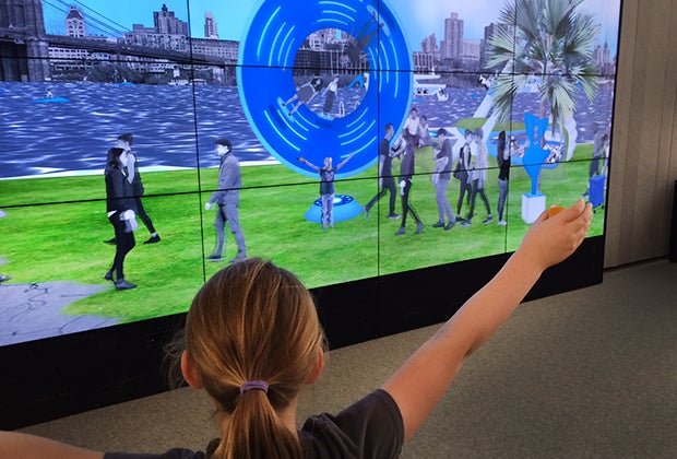 For my 8-year-old, creating designs was fun, but the Creation Wall's special lure lay in four dark circles in the carpet. By standing in each one, kids could see themselves transported into the scrolling screen designs as live, detailed, and often dancing images of themselves. Later, at home, we watched a video explaining how the Creation Wall was created by MCNY.