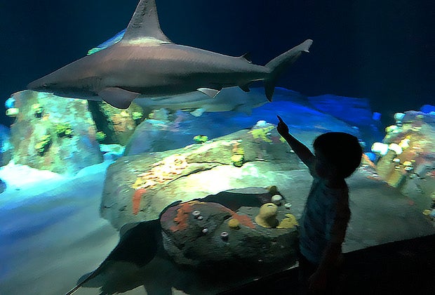 There is yet another floor-to-ceiling glass viewing wall with enormous sandbar sharks gliding by. Comfortable benches give little feet a rest, and provide a great place to watch the underwater action.
