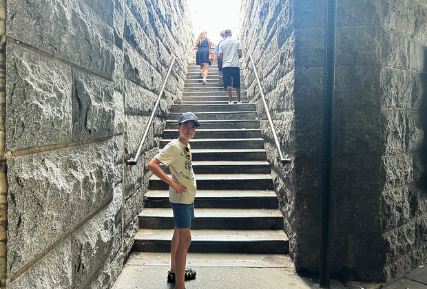 Ask the kids if they spot the cast-iron lamps, the circular "fans" on top of the towers (which are actually fences to prevent people from climbing), the American Flag, the Gothic arches, and all the cables. The cable spinning plaque is definitely worth a read to get a sense of how the cables were designed.