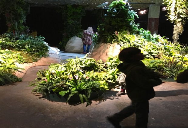 But then you walk into the drama. Illuminated by a single column of light coming from the ceiling, the man-made park looks like a fantastic island jungle. Really, it’s hard not to compare it to futuristic video game scenery or a real-life Avatar. The plantings are lush and varied. Labels tell visitors what each plant is, and close observers will find pineapples and other surprises amongst the vegetation.