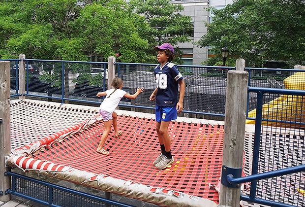 The trampoline-like netting at Nelson Rockefeller playground is a physical and mental challenge.