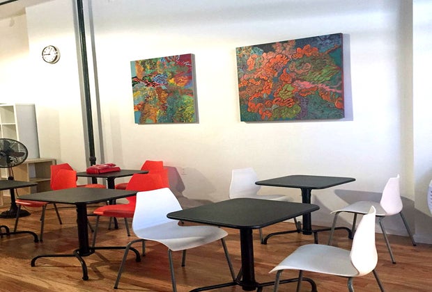 Kim refers to his facility as a "flex space," a community space that can be utilized as an indoor playground for families, art area, and events venue. One mom I met there described it as "a refreshing space with artistic sensibility." The art gallery and cafe vibe set it apart from typical play spaces, and Kim says the artwork on the walls will change over time.
