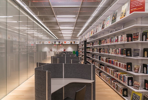 The Children’s Room and Teen Zone are both on the lowest level of the library. The Children’s Room, for ages 11 and under, is large and bright. Books—including board books for the littlest readers, a parenting section, and books in foreign languages including Russian, Chinese, French, and Spanish—line the perimeter, with child-sized tables and chairs in the middle. The books are new and won’t float to other locations until late July. Another fun fact: The large area rug in the Children's Room depicts a pixelated, almost abstract image of Manhattan, with the Bronx at the top and rivers on each side, all in shades of blue.