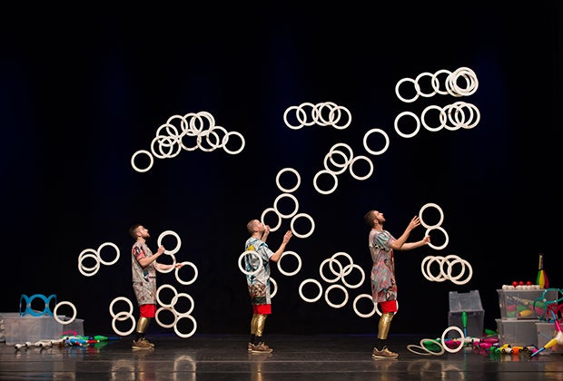 This Swedish trio takes juggling to the next level. Forget defying gravity with pins and balls, though they're plenty skilled throwing those around. These guys conjure eye-popping visuals by tossing open bottles of water, bags of candy, and toilet paper into the air so their contents stream out to a hypnotic electro-pop soundtrack. Who knew juggling could be so amusing and diverse? Good luck stopping the kids from trying this at home.