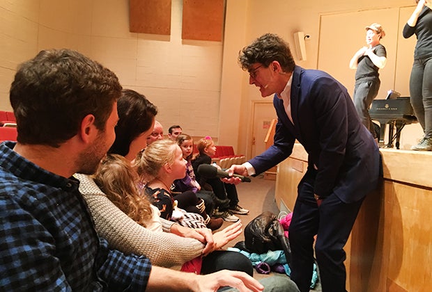 After teaching I Got Rhythm to the entire auditorium through call and response, a wireless microphone was passed around for each verse, putting kids and parents on the spot, to everyone’s delight. Audience members were even invited to take the stage for a rhyming contest, and again to play various roles in a scene. Little ones were mesmerized seeing peers suddenly participating on stage.