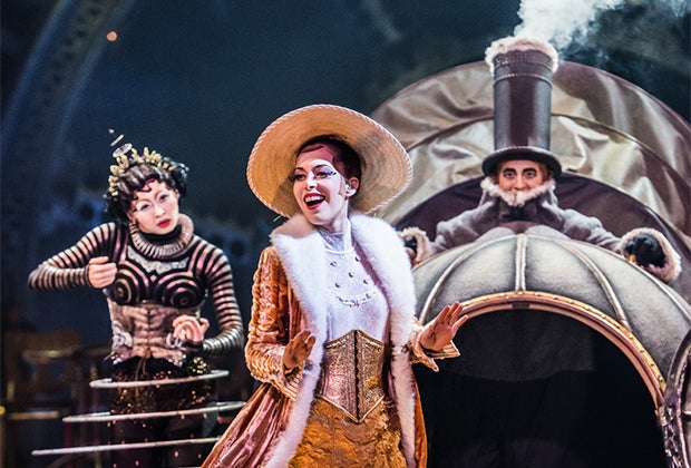 Subtitled Cabinet of Curiosities, Kurios has an immersive steampunk aesthetic, all gears, glass specimen jars, and gramophones. When you walk in you immediately feel transported to the Victorian era, when freak shows packed 'em in and inventors helped usher in the industrial revolution. There's a vague story line—a mad scientist called the Seeker and his minions, experiment with steam and electricity in order to push the boundaries of what's possible. But the wisp of a plot is incidental. You're there for the acts, and boy do they deliver, right from the grand opening number, when a 60-plus-foot steam train arrives onstage and the cast emerges. As the performers saunter around showing off their various skills, a juggler, Gabriel Beaudoin, takes the spotlight, adding unique touches that turn a familiar routine into an unforgettable variation. First, he trades his pins for what look like severed hands, a macabre switch which complements the show's atmosphere. Then at the end, he's suddenly lifted off the ground on a wire as he juggles in midair and it's amazing.