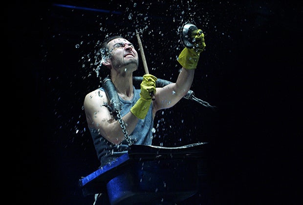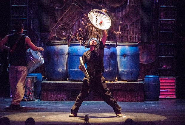 There is really no big overarching plot, and the performances are more like sketches strung together, but each act did use a mundane object to create music or at least a sound. Matchboxes, lighters, inner tubes, sticks, and shopping carts are all used in different and innovative ways. Of course, because this is a percussion performance, there are drums—big oil can-type drums played with high energy by performers, who even rappelled up and down the multi-level set. I was amazed by the fitness of the performers, who maintained a breakneck pace through almost the entire 90-minute, no-intermission show.